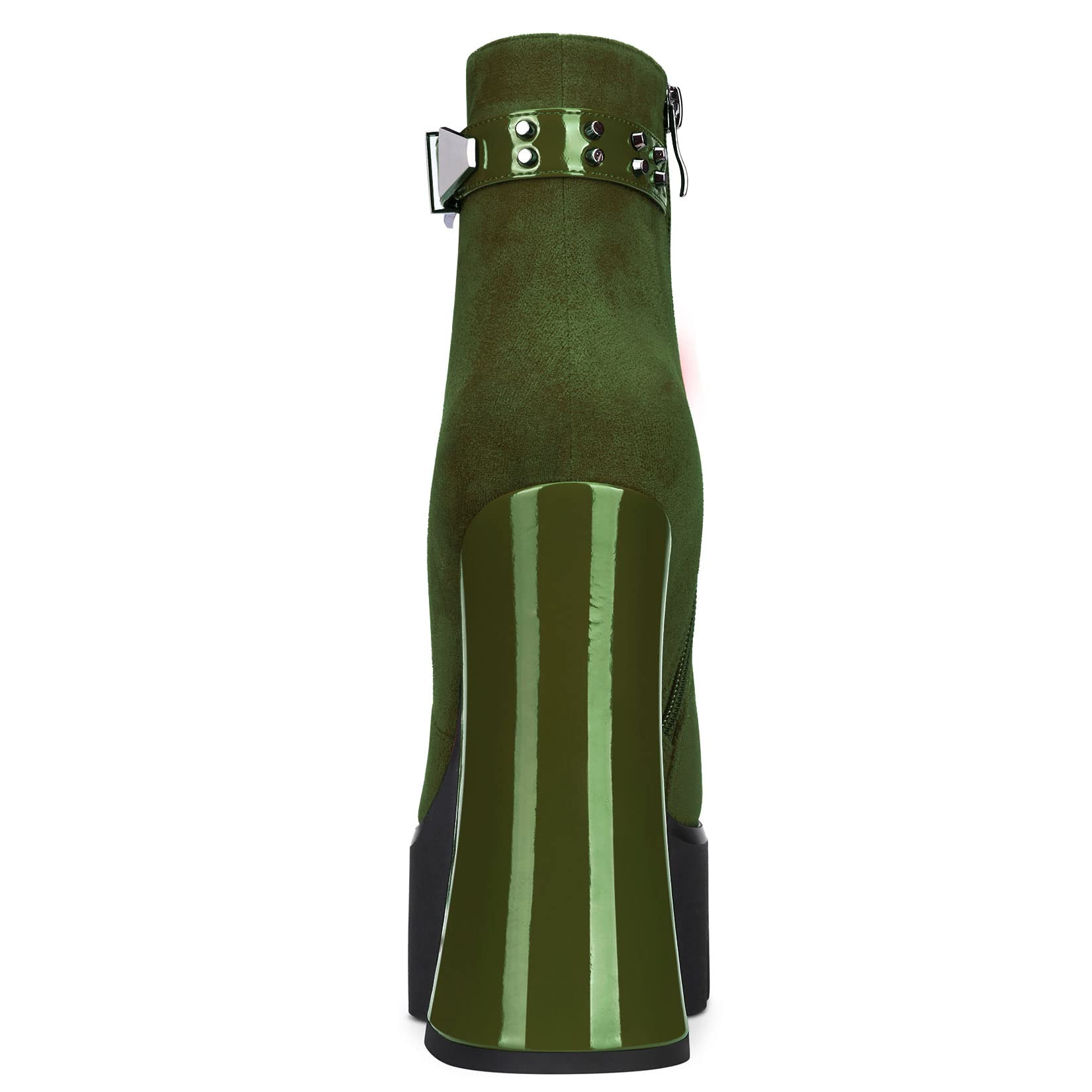 Aachcol Women Platform Ankle Boots Short Bootie Round Close Toe Chunky Block High Heel Suede Zipper Rivets Olive Green 5.5 Inch 10 US