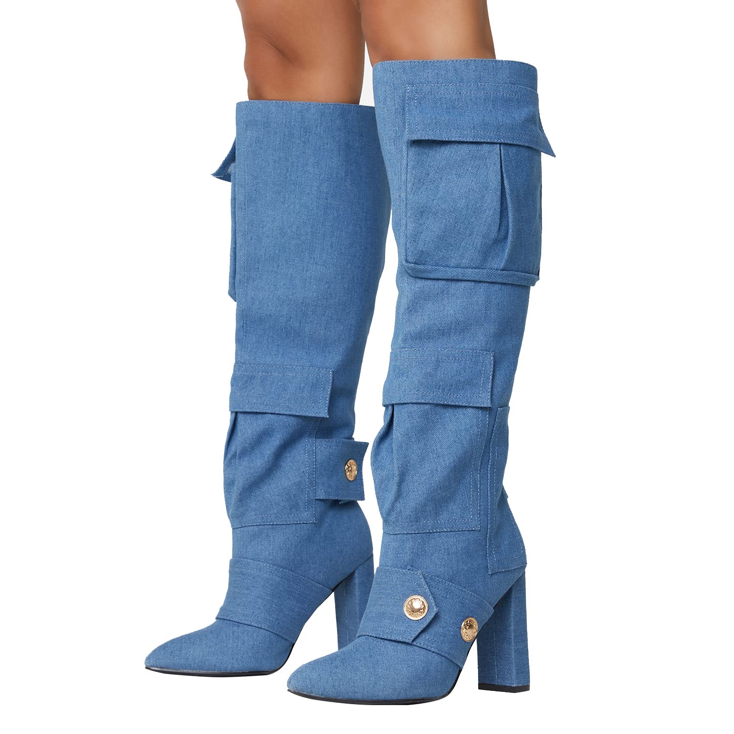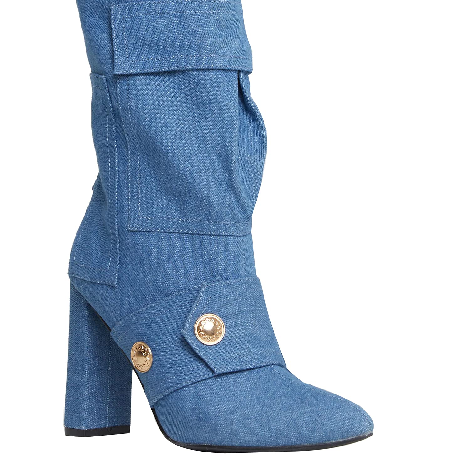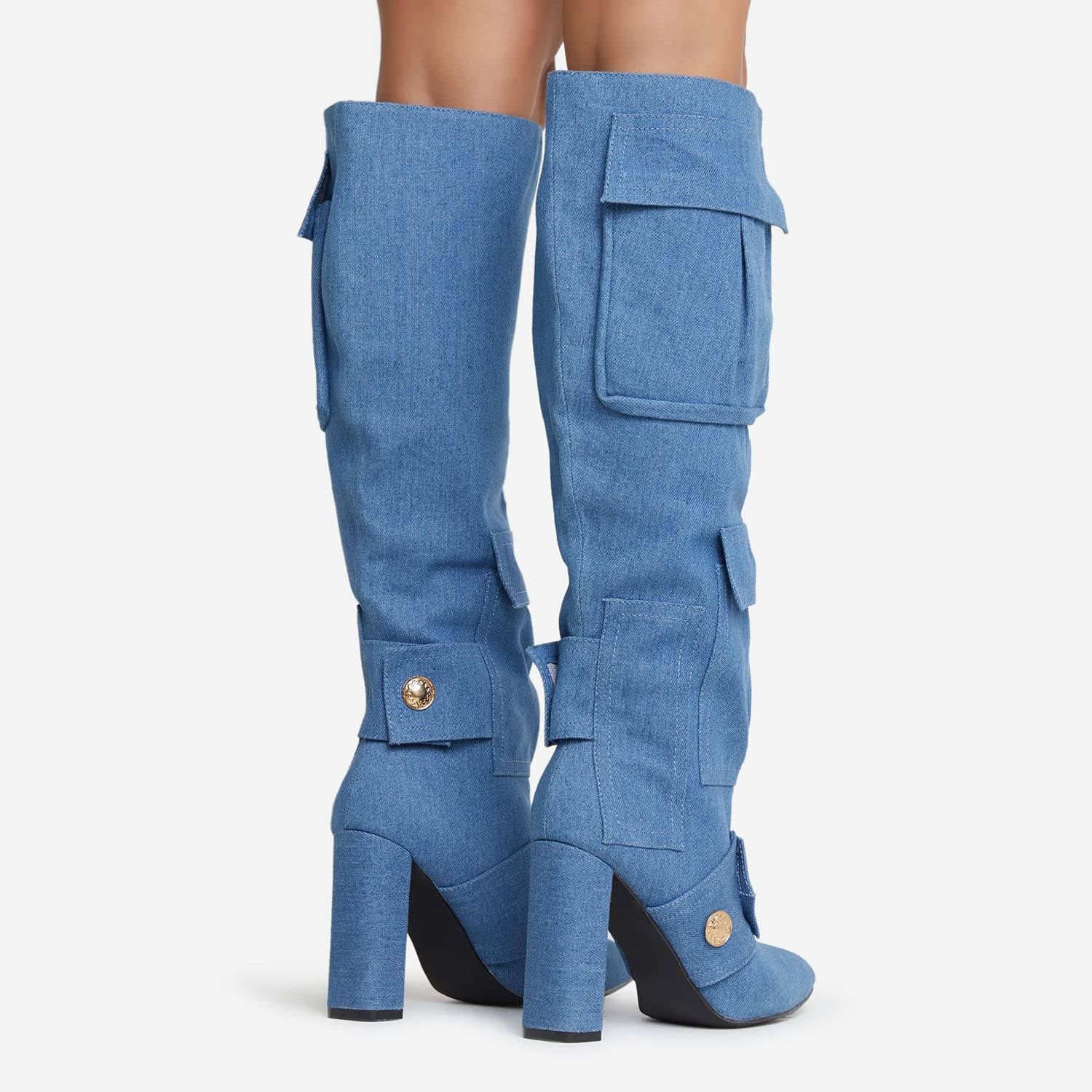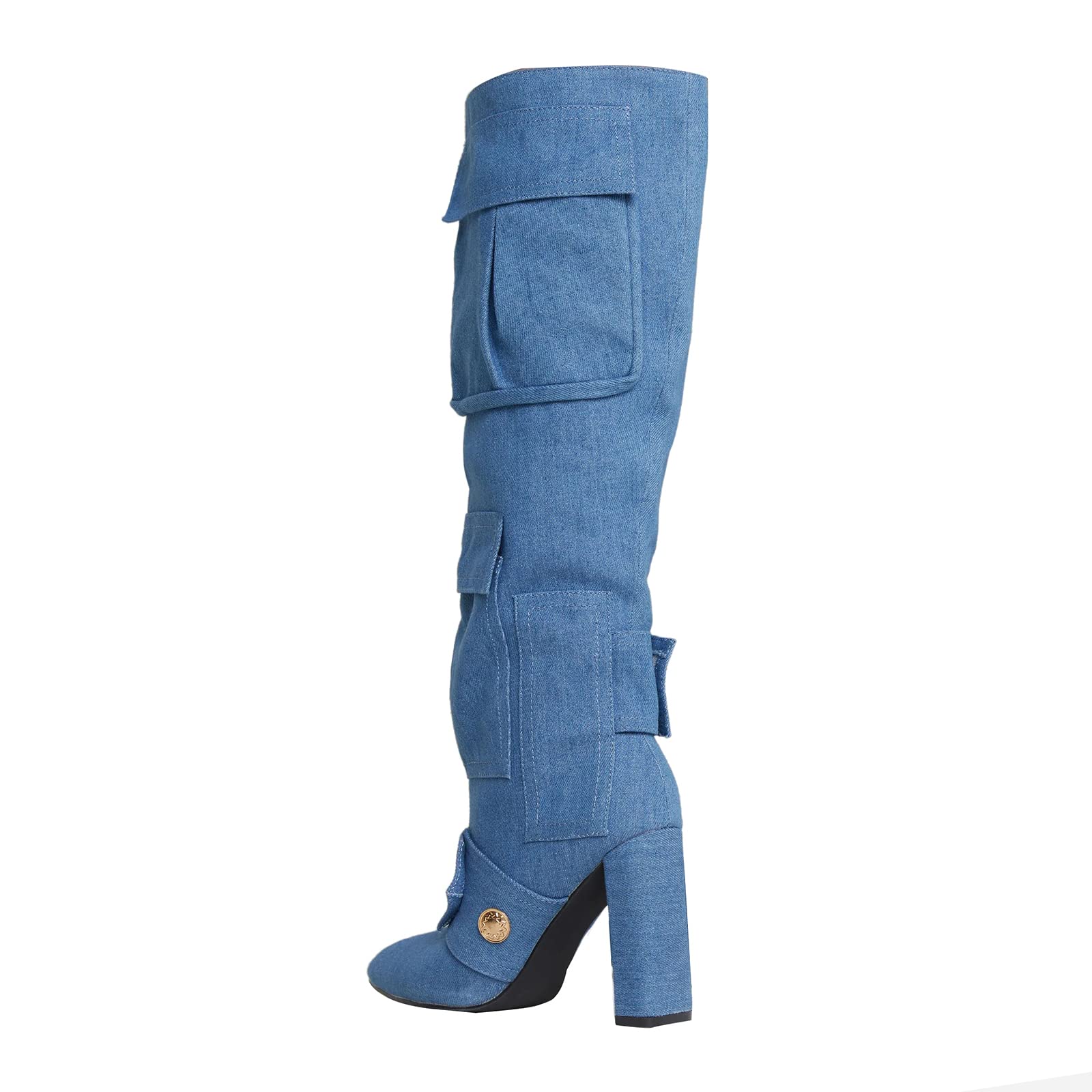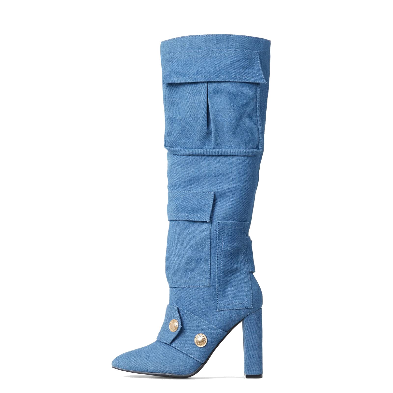 - - Camo print boots with multifunctional pockets, stud detailing, sexy pointed toe and chunky high heel.