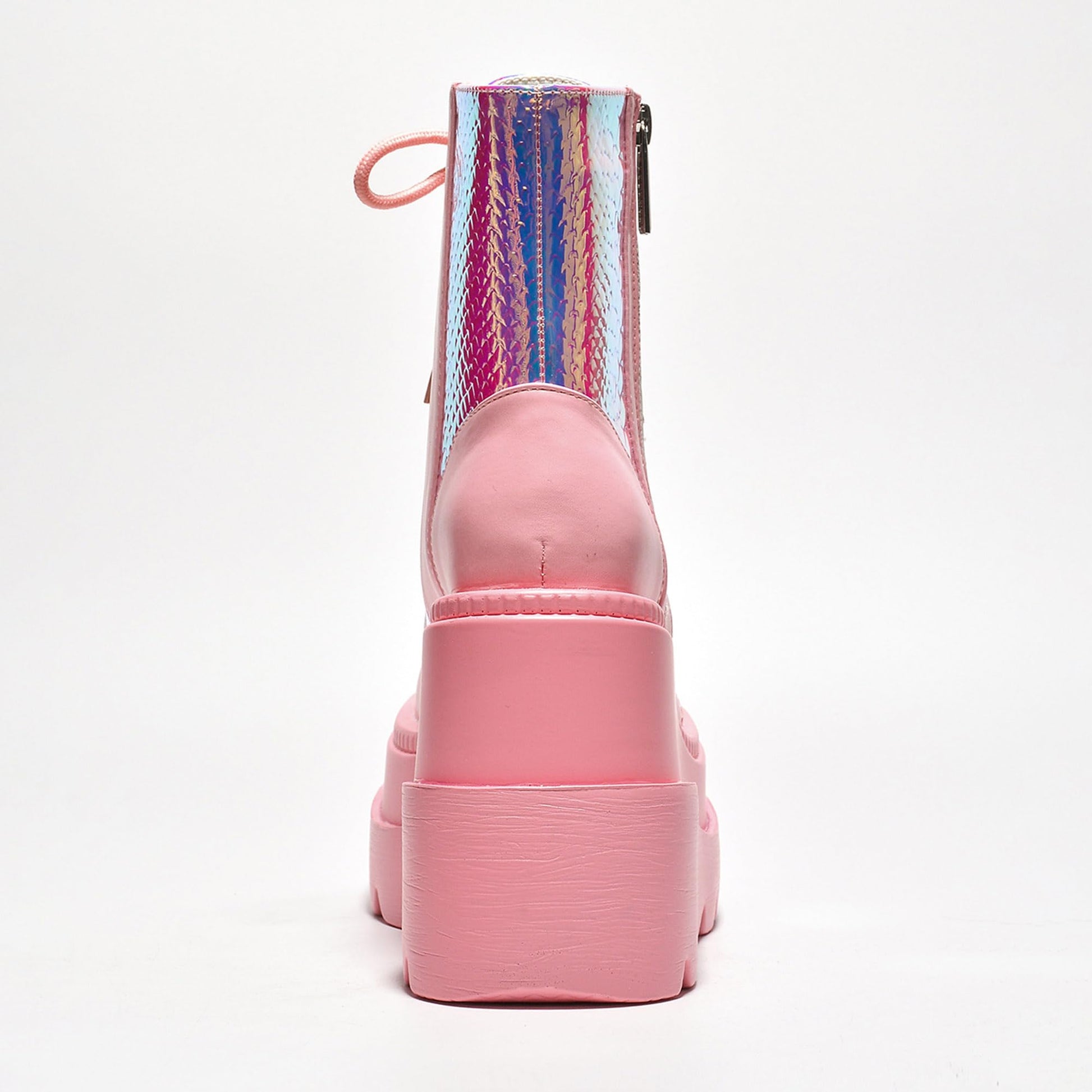 Cape Robbin Holographic Platform Ankle Boots for Women Chunky Block Heels Pointed Toe PU Leather with Buckle Strap Retro Futuristic Style (Radio) - Pink Size 9