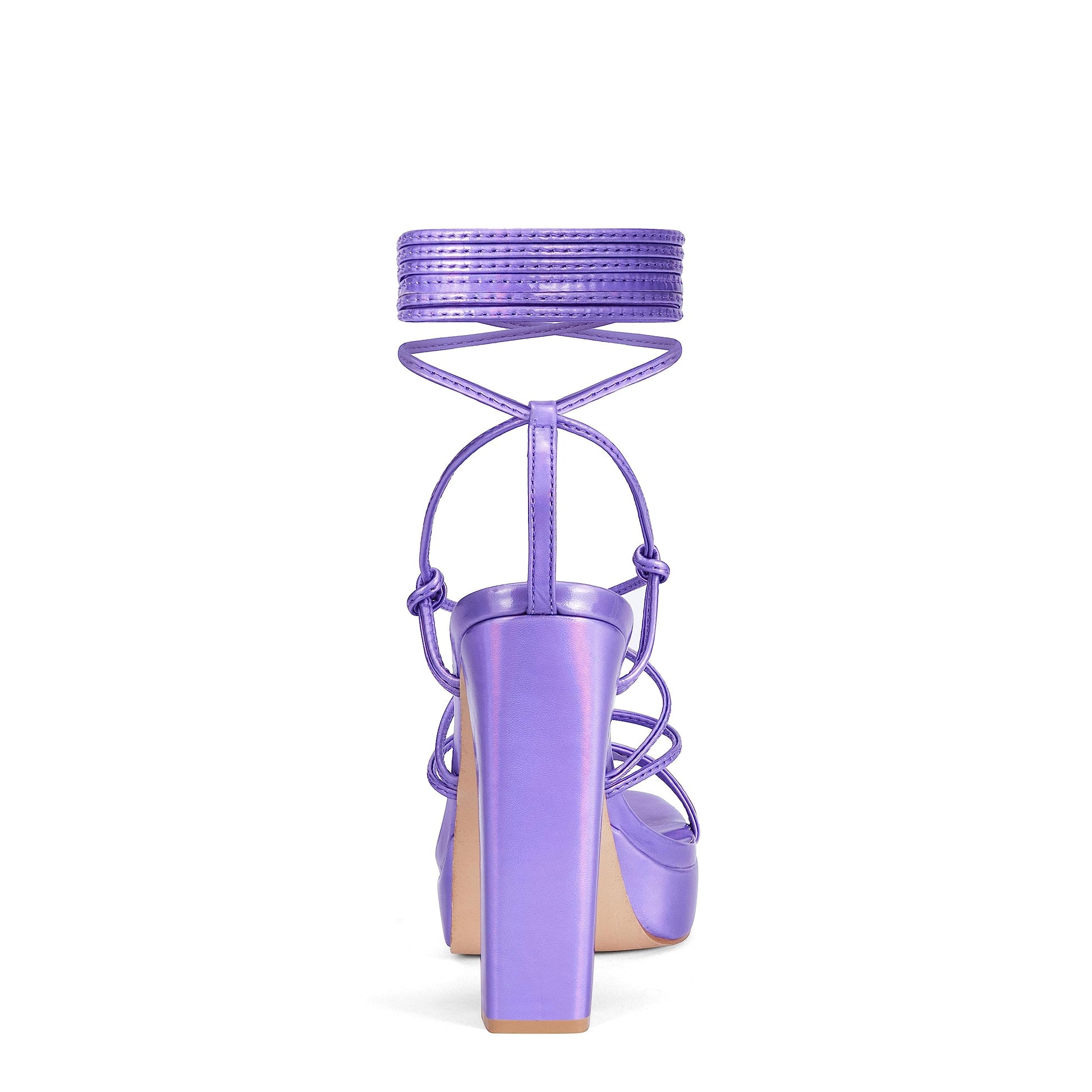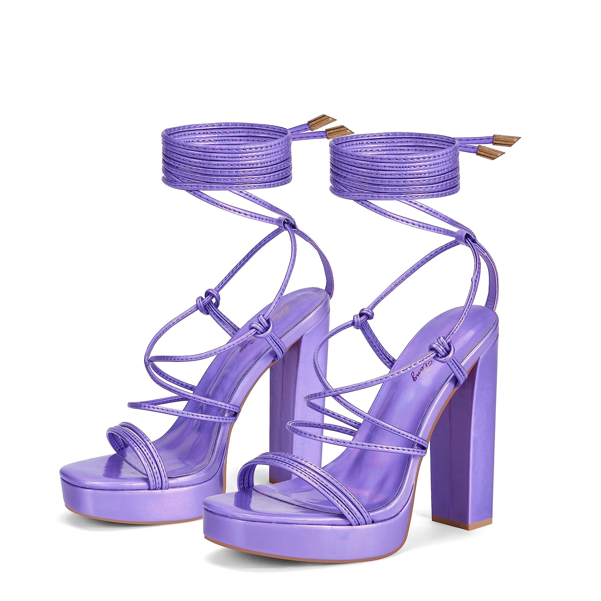 Elisabet Tang Women's Strappy Heeled Sandals, 5 inch Platform Heels Chunky Lace up High Heels Open Toe Party Shoes Purple Holographic Size 10