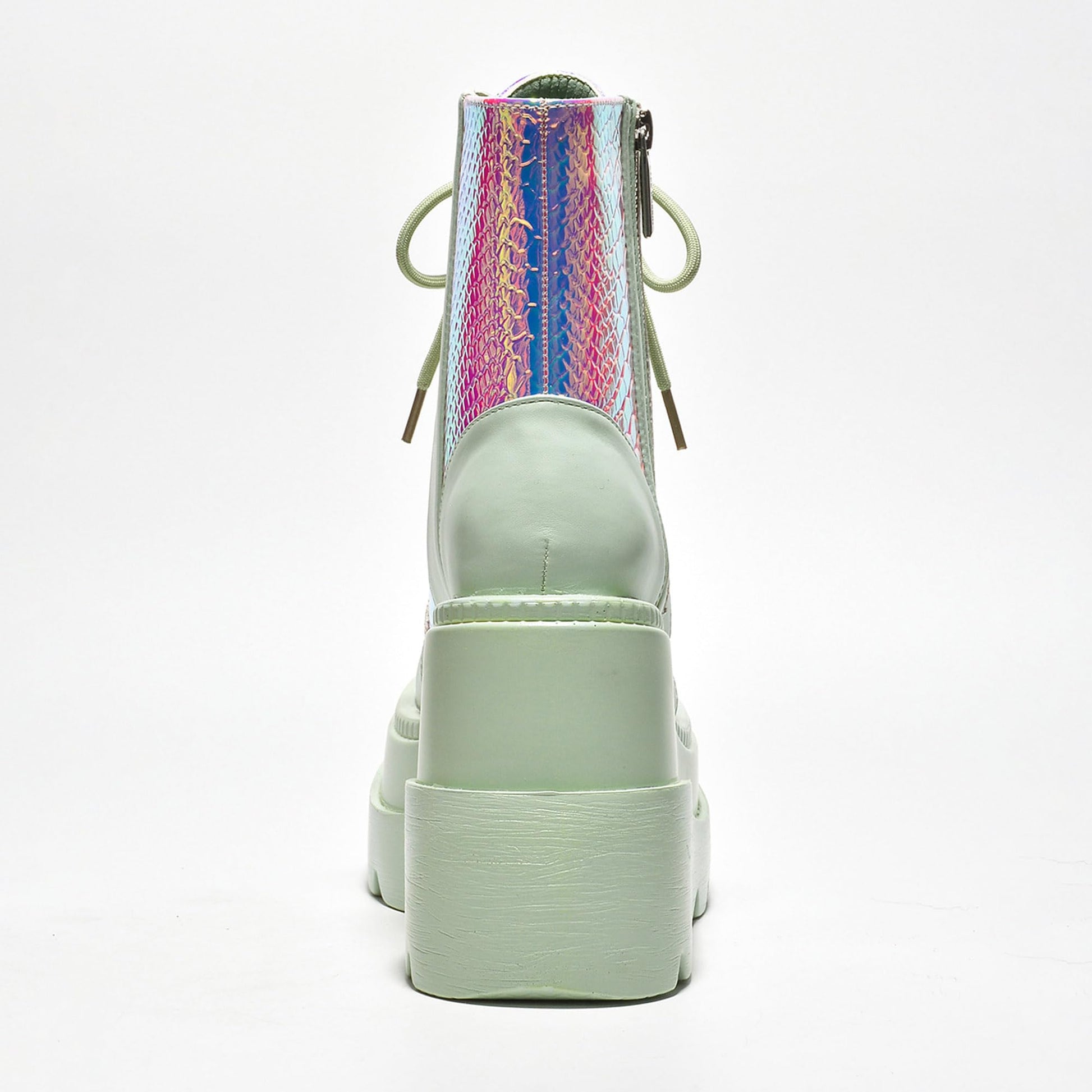 Holographic Platform Ankle Boots for Women Chunky Block Heels Pointed Toe PU Leather with Buckle Strap Retro Futuristic Style (Radio) - Sage Size 11