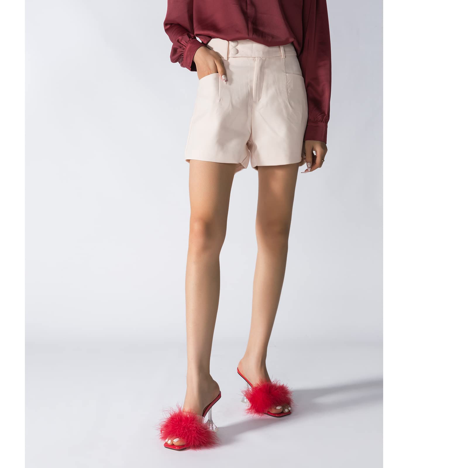 - Red heels for women sexy: 3.54-Inch pvc heel mules, open-toe mule style, lightly cushioned footbed clear heels with fluffy faux fur upper, rubber sole. The pyramid clear heel design provides stable support.