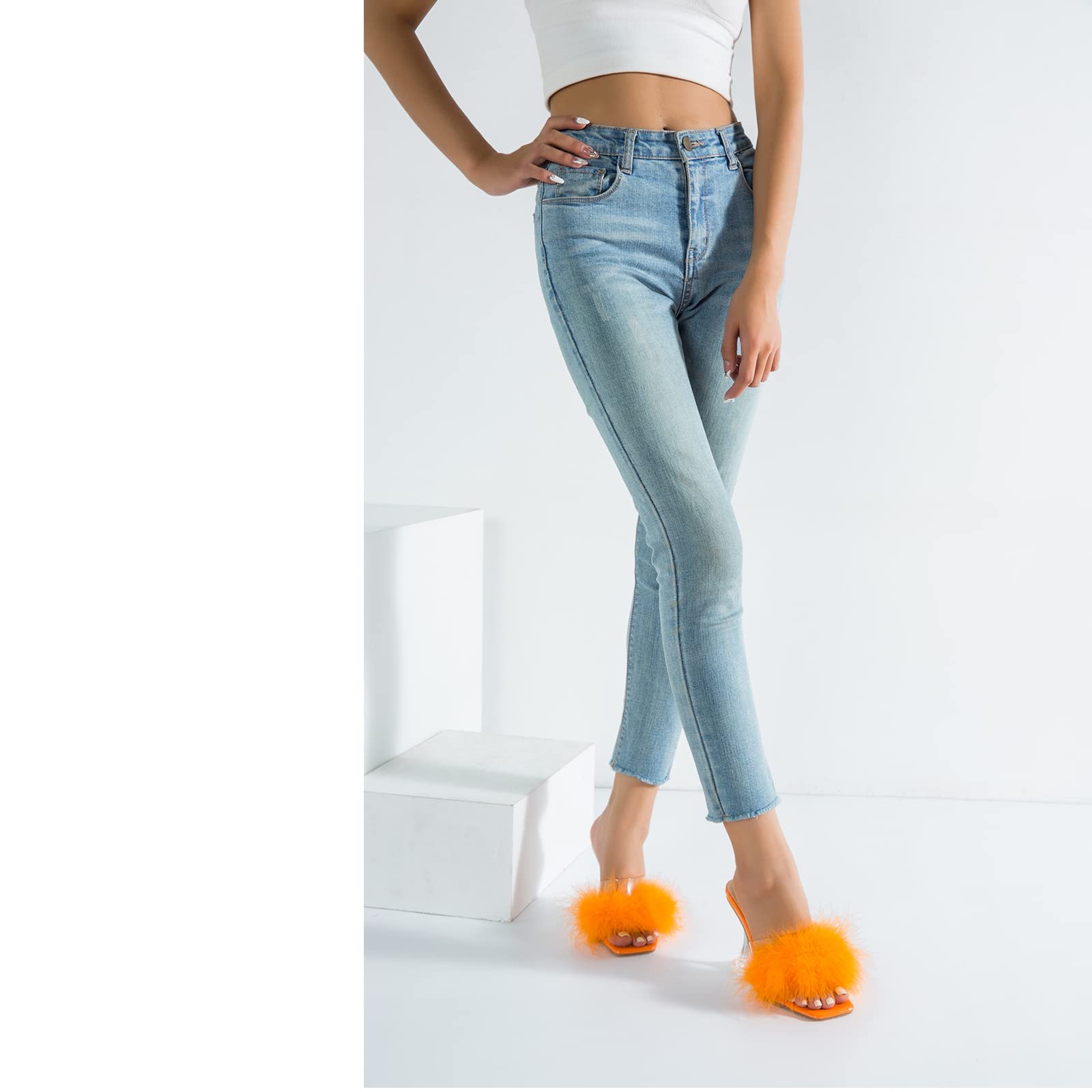 - Fuzzy Feather Heels Fashion: Elevate your style with these fancy shoes for women with square toe and a clear heel. The fashion-forward and sexy fluffy feather design adds charm, and the vibrant orange heels shoes for women dressy injects a pop of color into your wardrobe.