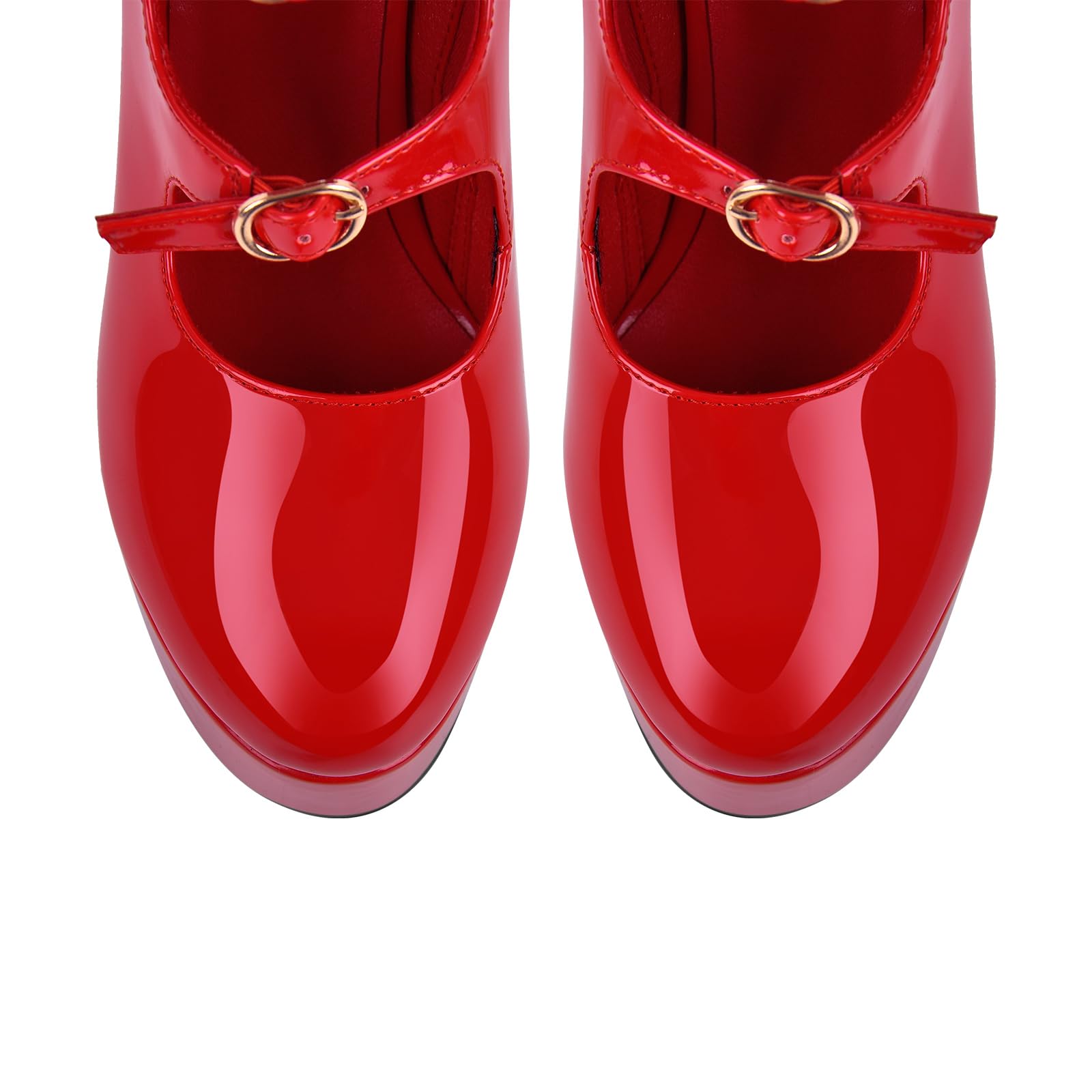 Rhineshell Women's Platform High Heels Side Zipper Adjustable Buckles Block Chunky Heel Faux Patent Leather Pumps Round Closed Toe Party Dress Hollow Out Ankle High Sandals Shoes Red