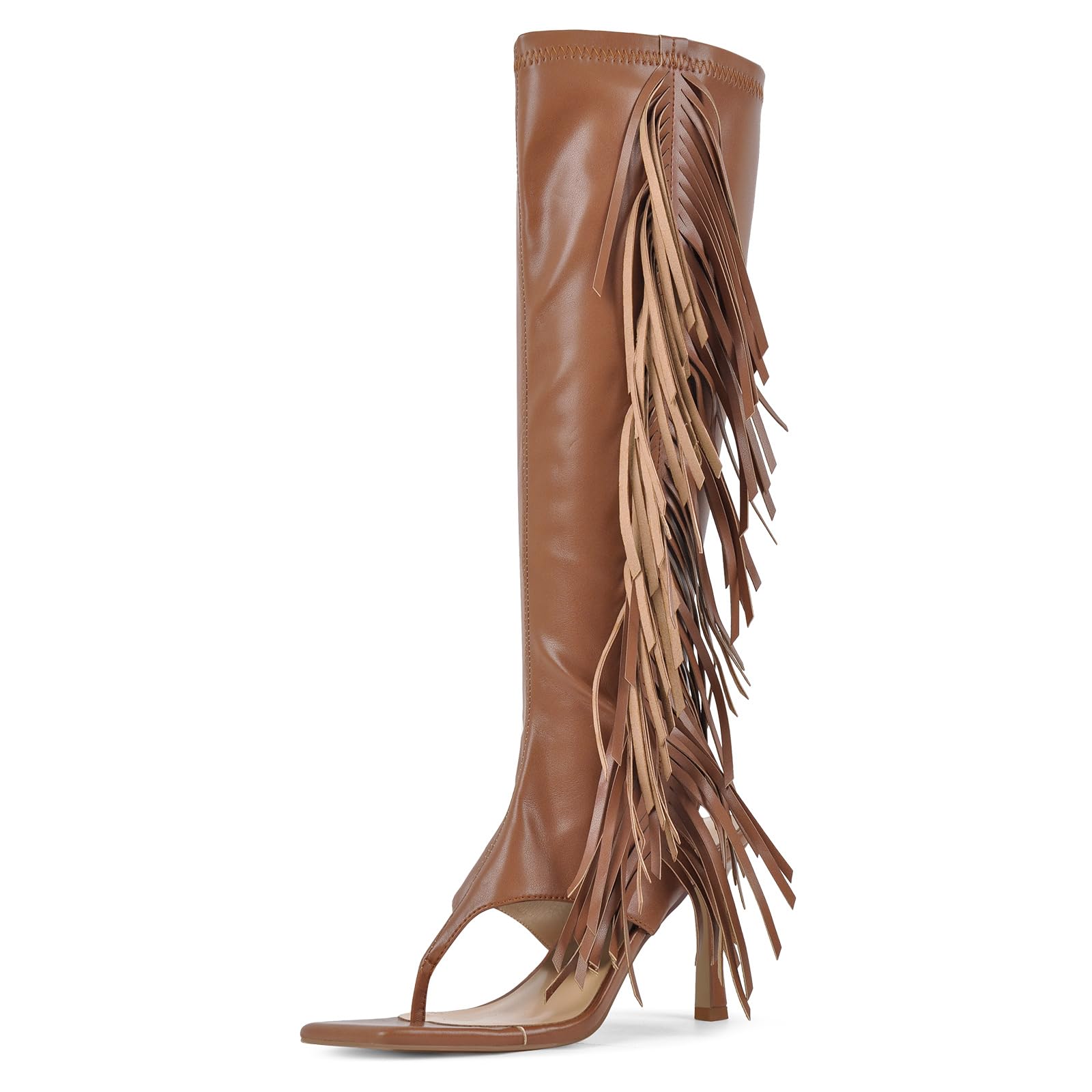 - Features fringe, stiletto heel knee high sandals boots