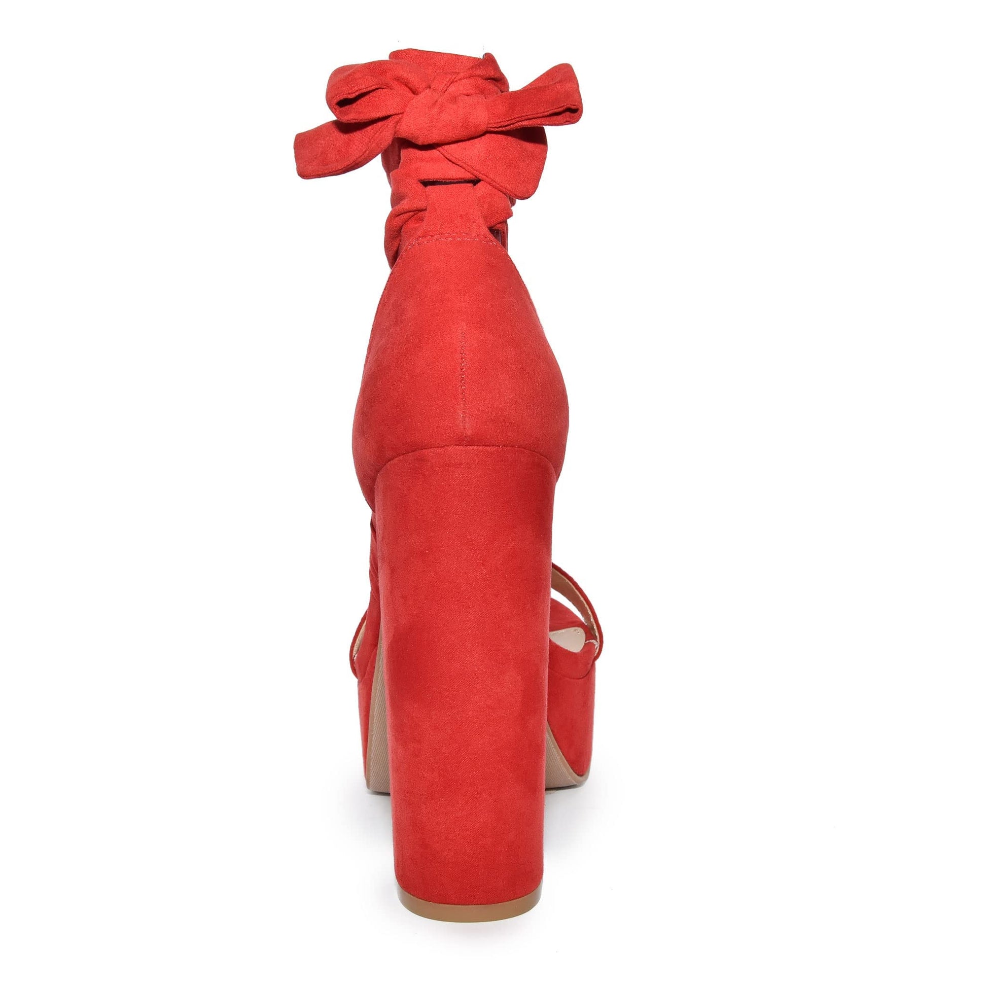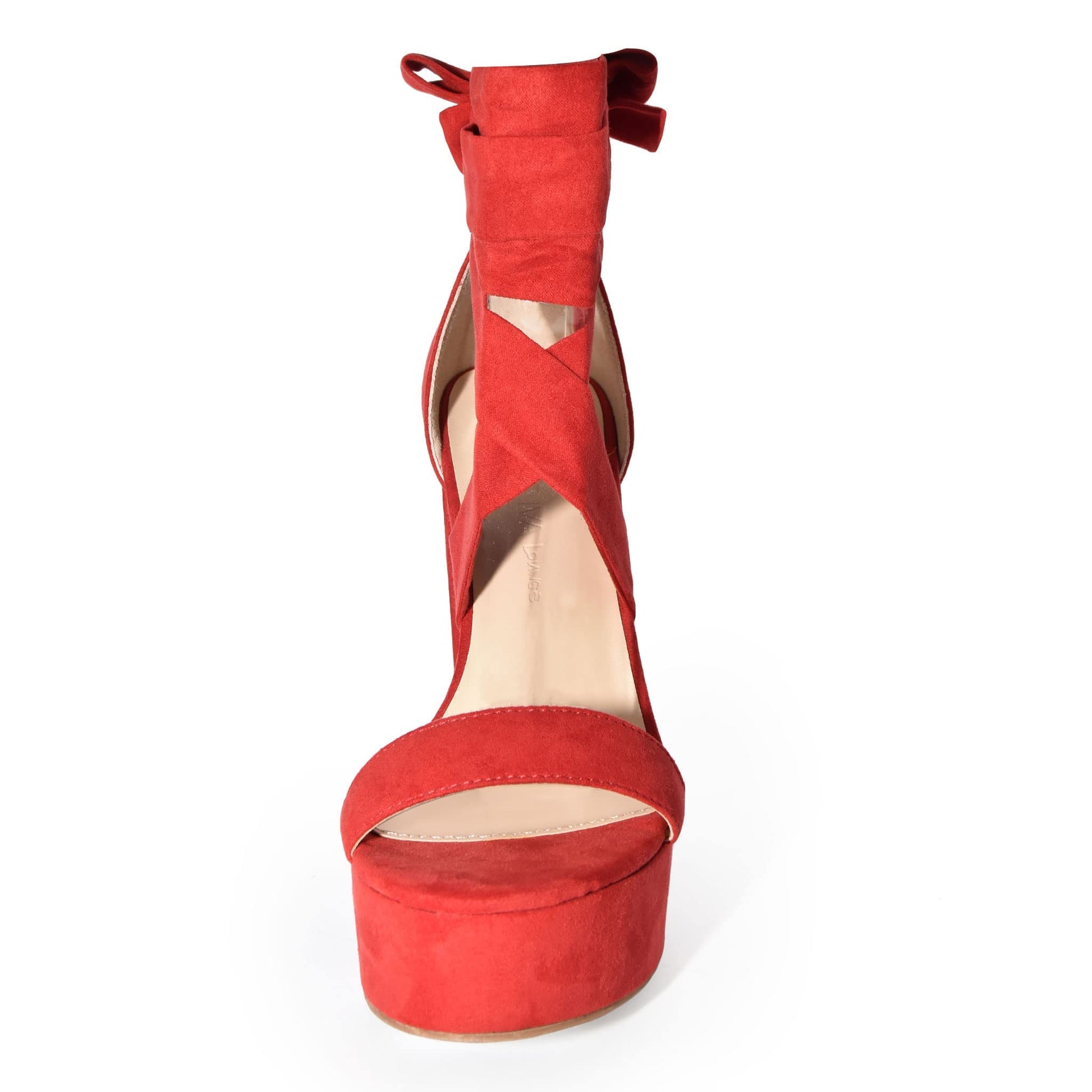 - These faux suede heels feature a single strap, lace-up crisscross design, open toe, has a high statement heel and has a sturdy platform. Style these with pants, skirts or dresses!