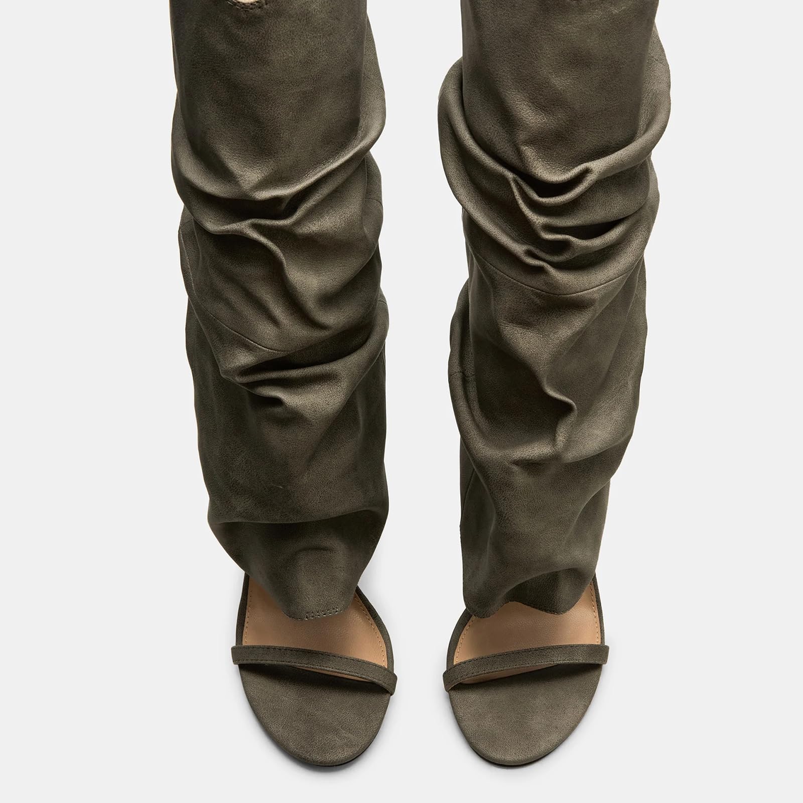 Yishaweiqi Slouched Ruched Knee High Heels for Women Round Open Toe Stiletto Heels Pull On Wide Calf Sandals